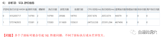 从分析上看,确实出现了两个不同子游标,其中一个游标的执行成本明显大于另外一个。正是因为这个问题,导致了刚才那个告警的出现。这种方式是针对关键SQL的,关键SQL是一个系统中对应用可用性或者SLA有着关键影响的SQL,我们可以在每个采样周期都对其进行监控。因为一个系统中的关键SQL的数量不会很大,因此这种专项监控的成本也不高。