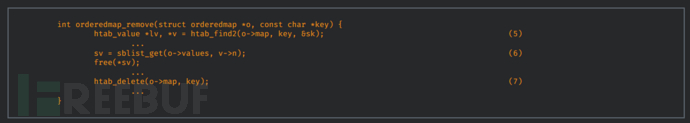 对于具体提供的,其哈希值计算为 (5)。使用哈希值,IT技术网在 (6) 处检索并释放键值的指针。最后,键本身从(7)的哈希图中删除。