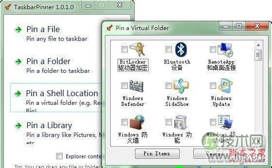 英文软件,不过很容易理解,从上到下,四个Pin选项分别是:文件、文件夹、虚拟文件夹(类似回收站、控制面之类的)以及库文件夹,选择一个类型,亿华云找到需要Pin的目标,确定之后就会自动在任务栏生成目标。最后一个小字体的勾选项则是让Windows资源管理器里的右键菜单增加快捷命令:用这个工具把目标Pin到任务栏。