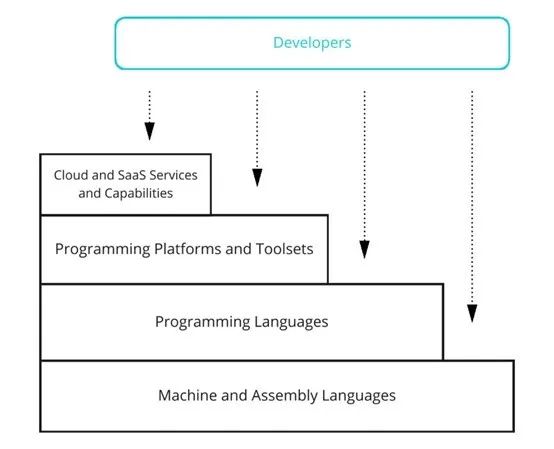 如图2所示,所有这些更高级的工具和服务改善了开发体验,延续了更少代码完成更多任务的趋势,大大提升了交付能力。这不仅可以让开发者更容易构建高价值的应用程序,而且也可以使其通过较少培训就能成为娴熟的开发者。较少培训意味着市面上会有更多的软件开发者。在此基础上,SaaS和基于云的应用程序时代诞生了。