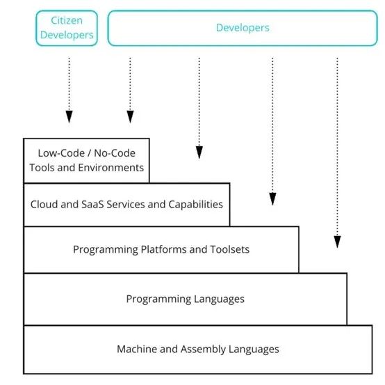 如图1所示,高级编程语言的出现改进了机器和汇编语言编程,通常可以通过更少的代码完成更多工作,这大大提升了研发团队的效率,使他们能够更快地交付更庞大、更出色的应用程序。软件开发仍是一项高度专业化的任务,需要高度专业化的技能和技术。但是越来越多的人学会了这些语言,软件开发者队伍随之壮大,由此,高效软件开发者的时代诞生。