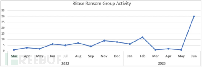 该勒索软件团伙于 2022 年 3 月首次出现,软件最开始时相对低调,团伙较少发生明显的开始攻击行为。但到了6 月,声名鹊起攻击活动开始激增,受害到目前为止,猛增新8Base 已在其暗网勒索网站上列出了 35 名受害者,勒索有时甚至会同时公布多达 6 名受害者。软件