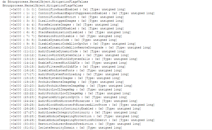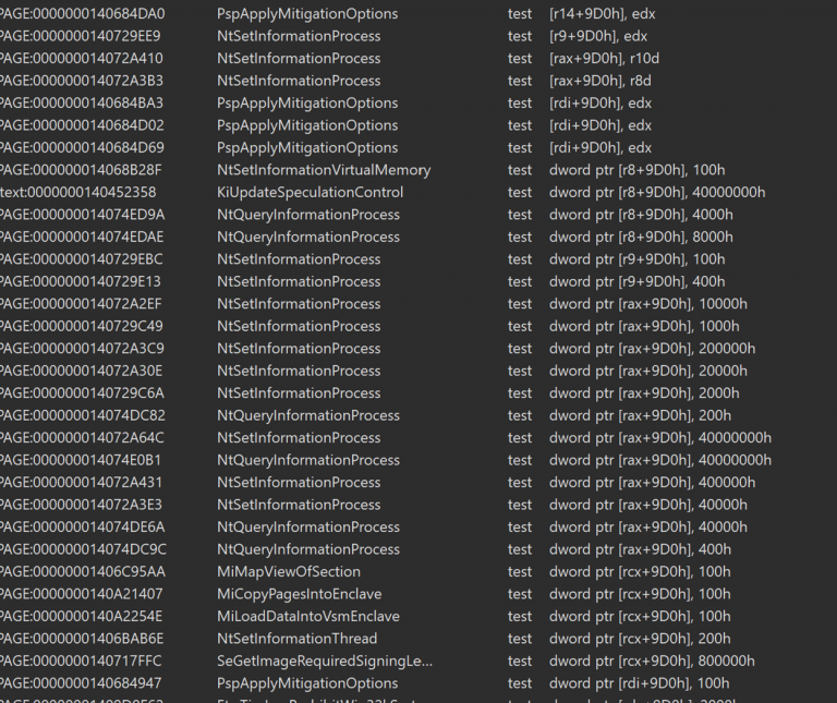 这会很慢,因为它是一个很大的二进制文件,并且一些结果与 EPROCESS 结构无关,因此你必须手动搜索结果。此外,仅查找对该字段的引用是不够的,MitigationFlags 包含 32 位,其中只有两个与当前上下文相关。所以,你必须搜索所有的结果,找出以下情况: