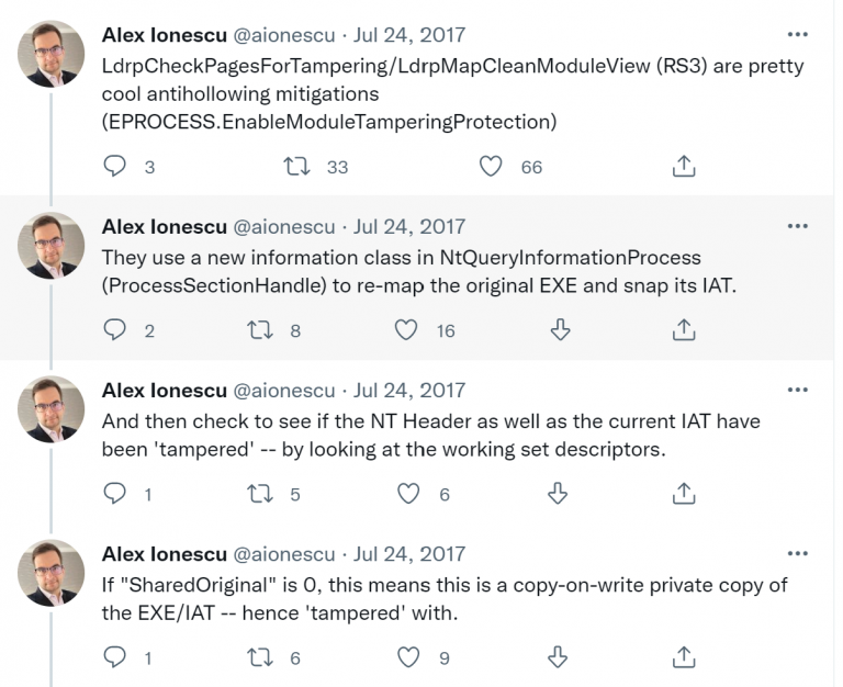 为什么该特性特别选择检查这两个范围——导入表和 NT 标头?这是因为这两个地方经常会成为试图虚化进程的攻击者的目标。如果主图像未映射并被恶意图像替换,则 NT 标头将不同并被视为已篡改。进程空心化(Process hollowing)还可以篡改导入表,以指向与进程预期不同的函数。所以,这主要是一个反空心化的功能,目标是发现主图像中的篡改企图,并用一个没有被篡改的新图像副本替换它。