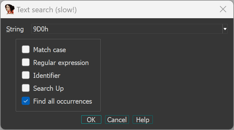 相反,你可以尝试不同的方法并尝试找到对 EPROCESS 的 MitigationFlags 字段的引用,并可以访问这两个标志中的一个。但除非你可以访问 Windows 源代码,否则没有简单的方法可以做到这一点。但是,你可以做的企商汇是利用 EPROCESS 是一个大型结构并且 MitigationFlags 存在于它的末尾,偏移量 0x9D0 的事实。一种非常粗暴但有效的方法是使用 IDA 搜索功能并搜索所有对 9D0h 的引用: