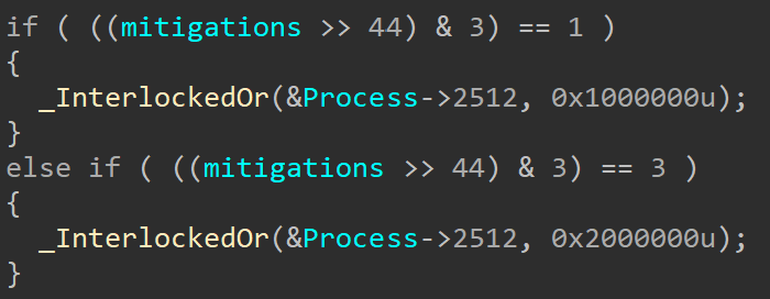 这些值与 Map 顶部的 DWORD 相关,因此模块篡改保护位实际上位于 Map的第 44 位,在 Hex Rays 屏幕截图中以及在 PspApplyMitigationOptions 中检查的是相同位。