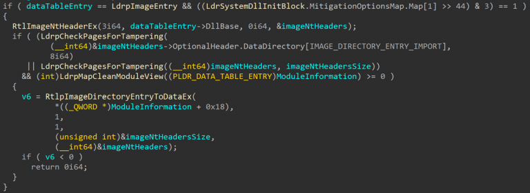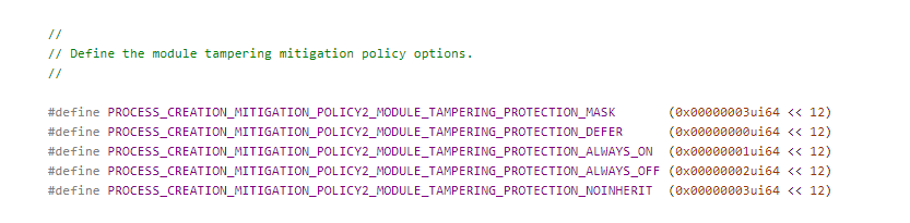比较或设置MitigationFlags字段为0x10000000 (EnableModuleTamperingProtection)或0x20000000 (EnableModuleTamperingProtectionNoInherit)。或者通过诸如bt或bts之类的汇编指令,按位数测试或设置位28或位29。