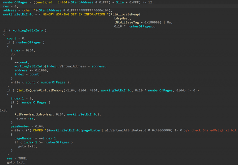此 SharedOriginal 位是由 LdrpCheckPagesForTampering 检查的,以判断此页面是原始副本还是由于更改而创建的新副本。如果这不是原始副本,这意味着该页面以某种方式被篡改,因此该函数将返回 TRUE。 LdrpCheckPagesForTampering 对正在查询的每个页面运行此检查,如果其中任何一个被篡改,则返回 TRUE。