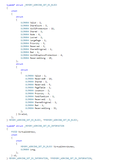 这些设置保存为可以通过 NtQueryVirtualMemory 查询的标志,这里使用的信息类:MemoryWorkingSetExInformation。它将在 MEMORY_WORKING_SET_EX_INFORMATION 结构中返回有关查询页面的数据: