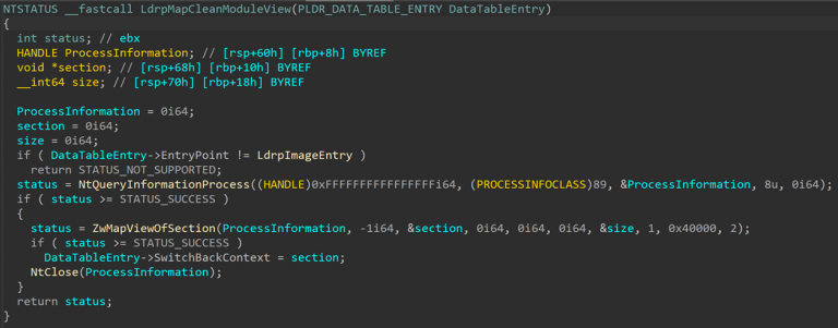 这个函数简短而简单:它使用 InformationClass == 89 (ProcessImageSection) 调用 NtQueryInformationProcess 来获取主图像的部分句柄,然后使用 NtMapViewOfSection 重新映射它并关闭句柄。它将新部分的地址写入 DataTableEntry->SwitchBackContect,以代替原来的篡改映射。