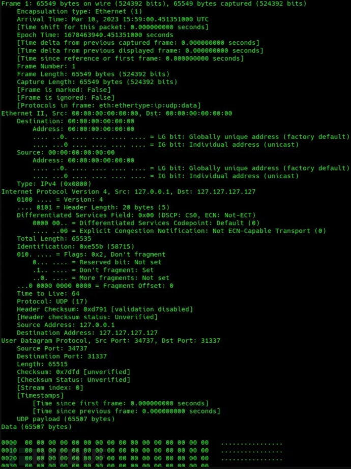 HTTP数据包的大小在484和589字节之间。而HinataBot产生的UDP数据包则特别大(65,549字节),由大量的空字节组成。