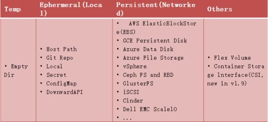 对Kubernetes存储,主要有应用的基本配置文件读取、密码密钥管理;应用的存储状态、数据存取,不同应用间数据共享等三大使用场景。目前Kubernetes支持的Volume Plugins如下表:
