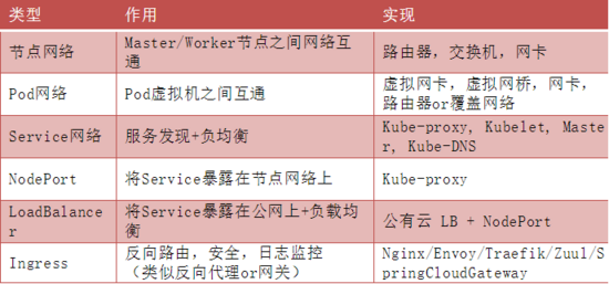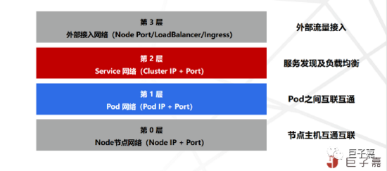 第4层:Kubernetes Service网络是集群内部网络,集群外部是无法访问,需要将内部服务暴露外部才能访问。Kubernetes通过NodePort,LoadBalancer和Ingress多个方式构建外部网络接入能力。