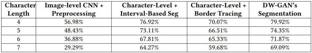 DW-GAN方法为解决这一问题,研究人员提出一种基于机器学习方法的CAPTCHA识别器——DW-GAN。与近年来基于人工智能方法的CAPTCHA识别器方法不同,DW-GAN 使用GAN来去除背景噪声,使用增强的字母分割算法来处理可变字符长度的CAPTCHA图像。