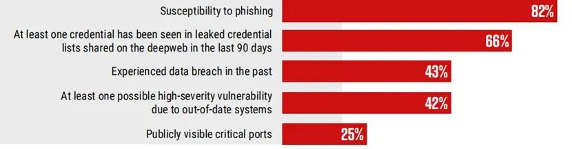 而在与勒索软件相关的安全问题中,“网络钓鱼”的易感性位居榜首,占比82%;泄漏凭据占比66%;数据泄露占比43%;高危漏洞占比42%;公开可见的关键端口占比25%。网络钓鱼对于攻击者来说,成本极低,而一旦成功,即可创造巨额收益。根据思科《2021年网络安全报告》显示,去年86%的组织至少有一个人点击了网络钓鱼链接。此外,数据还表明网络钓鱼占数据泄露事件的90%左右。