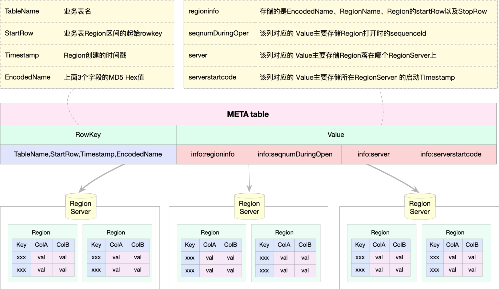 HBase数据从RegionServer的读写位置,在HBase0.96版本后,只依赖于hbase:meta表,企商汇hbase:meta表存储了所有用户HRegion的位置信息,hbase:meta的一个rowkey就对应一个Region,meta表只有一个列簇info,每一行数据又分为4列,如下所示。