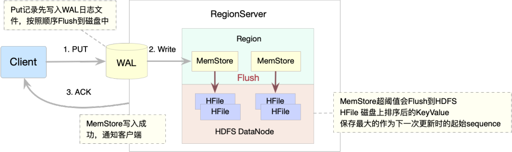 写完WAL日志文件后,HRegionServer根据Put中的TableName和RowKey找到对应的HRegion,并根据Column Family找到对应的HStore,并将Put写入到该HStore的MemStore中。此时写成功,并返回通知客户端。