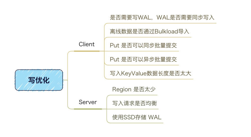 在HBase数据写入的过程中,会遇到写性能较差、数据根本写入异常问题,可以考虑从下图的思路进行优化: