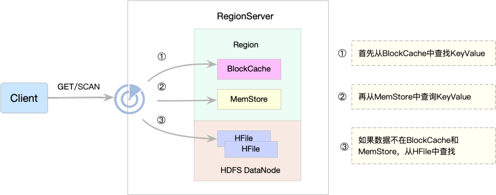 HBase数据查询链路,相对写链路比较复杂,在HBase写数据时,相同的Cell(RowKey /ColumnFamily /Column 相同)并不保证在一起,删除一个Cell也只是写入一个新的Cell,标记为Delete,需要从BlockCache、MemStore、StoreFile(HFile)中依次扫描,再将将结果合并即可(Merge Read),流程如下图所示: