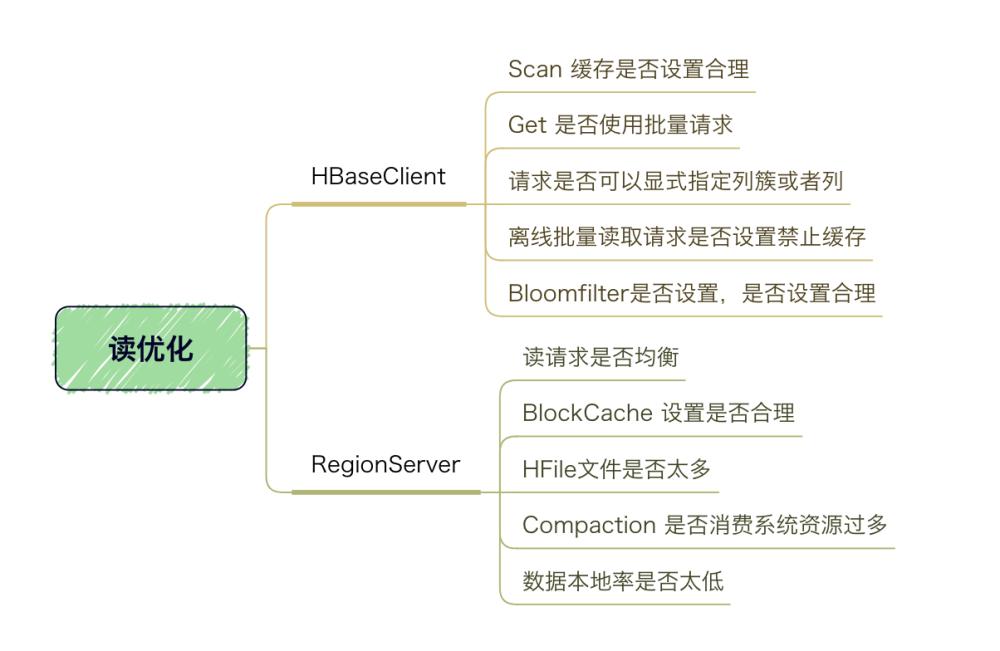 其中StoreFile的扫描,先会使用Bloom Filter过滤那些不可能符合条件的HFile,然后使用Block Index快速定位Cell,并将其加载到BlockCache中,然后从BlockCache中读取。我们知道一个HStore可能存在多个StoreFile(HFile),此时需要扫瞄多个HFile,如果HFile过多会引起性能问题。在HBase数据查询的过程,会遇到数据查询过慢问题,可从下图思路进行优化: