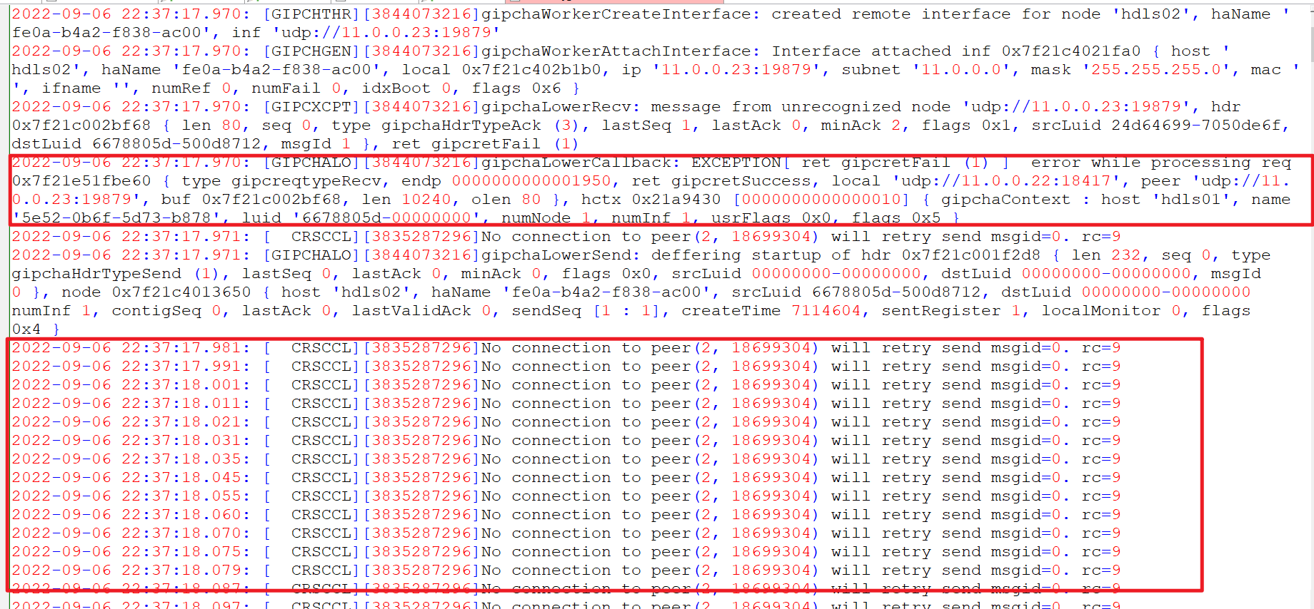 2022-09-06 22:37:17.970: [GIPCHALO][3844073216]gipchaLowerCallback: EXCEPTION[ ret gipcretFail (1) ] error while processing req 0x7f21e51fbe60 { type gipcreqtypeRecv, endp 0000000000001950, ret gipcretSuccess, local udp://11.0.0.22:18417, peer udp://11.0.0.23:19879, buf 0x7f21c002bf68, len 10240, olen 80 }, hctx 0x21a9430 [0000000000000010] { gipchaContext : host hdls01, name 5e52-0b6f-5d73-b878, luid 6678805d-00000000, numNode 1, numInf 1, usrFlags 0x0, flags 0x5 }
