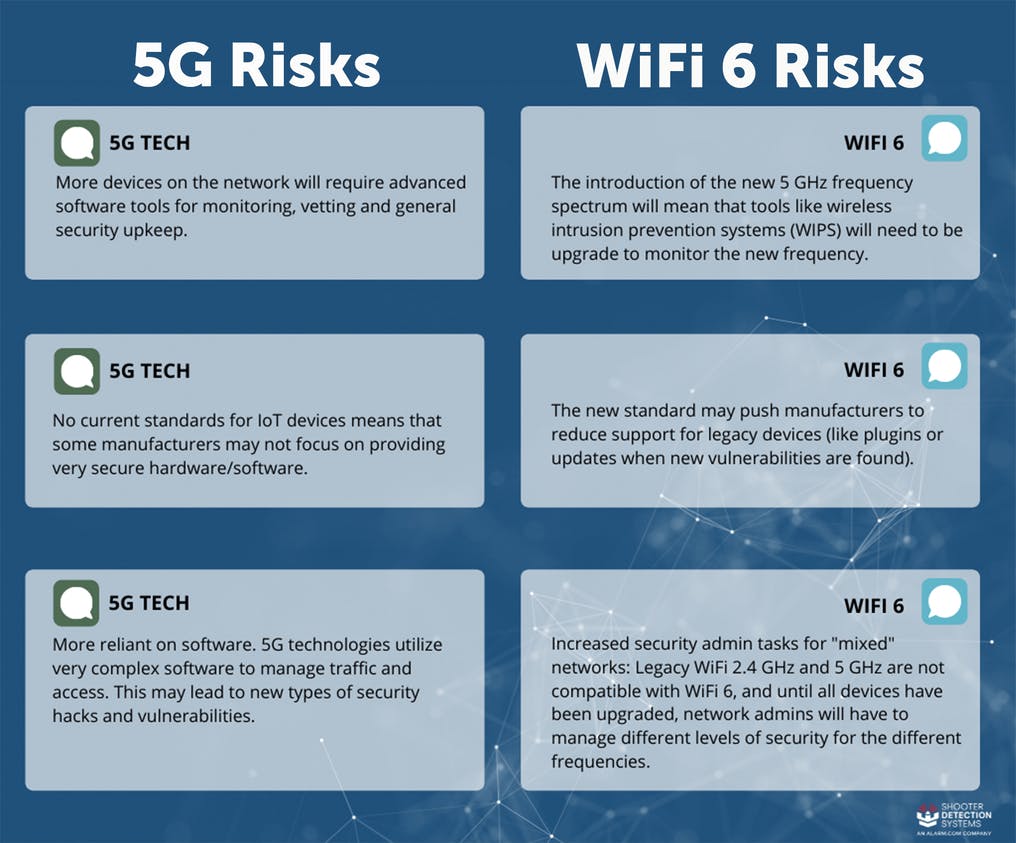 您是否应该密切关注 WiFi 6 和 5G?答案取决于机构的目标。 WiFi 6 和 5G 表明,更多设备现在可以以更高的速度连接——但这真的需要出于安全目的吗?如果客户正在连接数百个都具有高数据吞吐量需求的用户——比如学校里满是使用虚拟现实头盔的学生,或者整个体育场的球迷都在访问增强现实智能手机应用——答案是肯定的。然而,如果最终用户每秒只需要发送 1 Mb 的数据——相当于 1 分钟的 MP3 压缩音频或来自数码相机的 1000 万像素图片——那么答案是响亮的:不。
