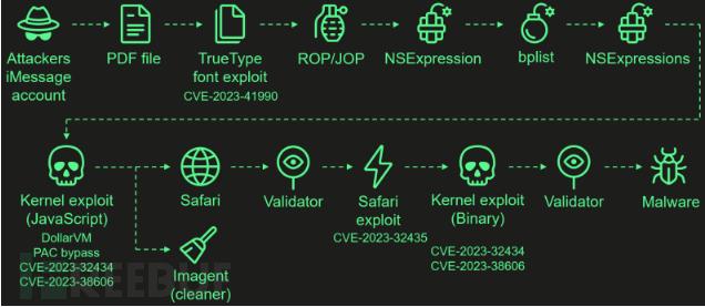 三角测量操作Operation Triangulation 是杂程一个针对 Apple iPhone 设备的间谍软件活动,同时利用了四个零日漏洞。这些漏洞链接在一起,形成零点击攻击,允许攻击者提升权限并执行远程代码执行。