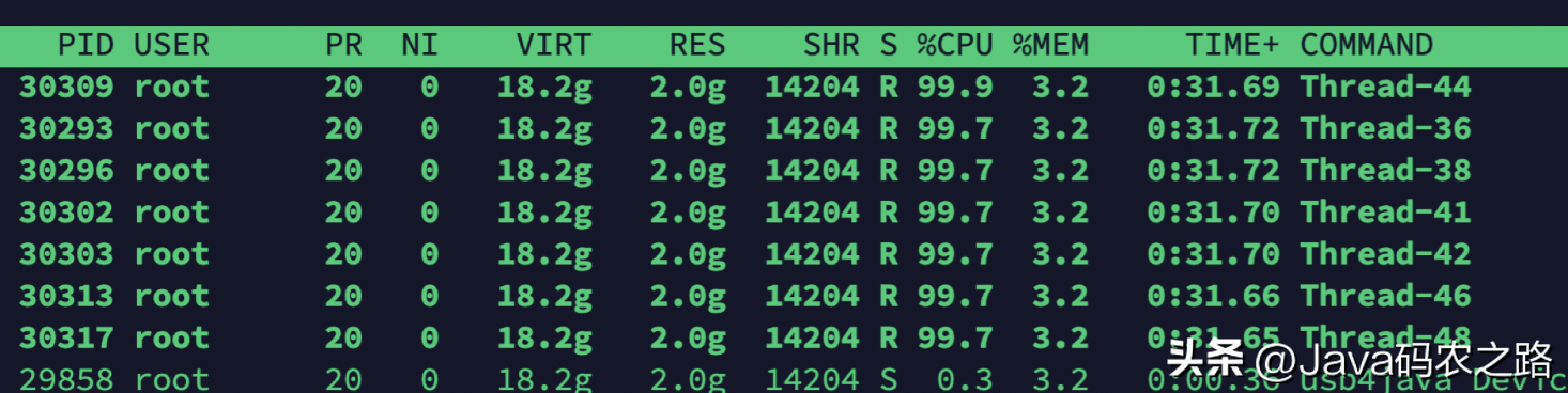 使用 top -Hp <pid> 命令(为Java进程的id号)查看该Java进程内所有线程的资源占用情况(按shft+p按照cpu占用进行排序,按shift+m按照内存占用进行排序)