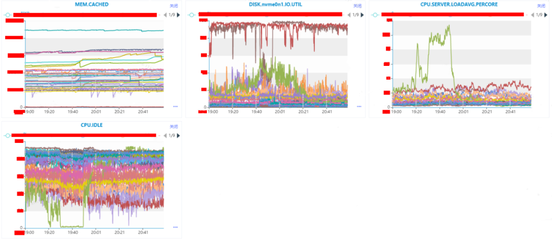 CPU.SERVER.LOADAVG.PERCORE和CPU.IDLE这俩个反应CPU使用情况的指标上代表绿色的机器在存在异常,在这里我们假设绿色的机器叫做Z。