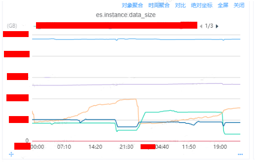 通过监控我们分析可以得到浅黄色、深蓝色、浅绿色三个实例是存在较大的磁盘数据量大小的增长情况,可以比较明显导出磁盘增长到90%的原因是浅黄色线代表的实例导致的原因。