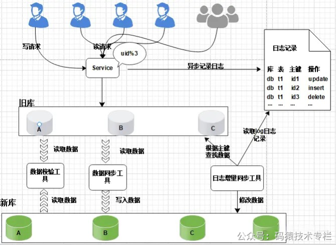 只对旧库进行读取操作, 如果同步出现问题, 都可以对新库进行回滚操作。