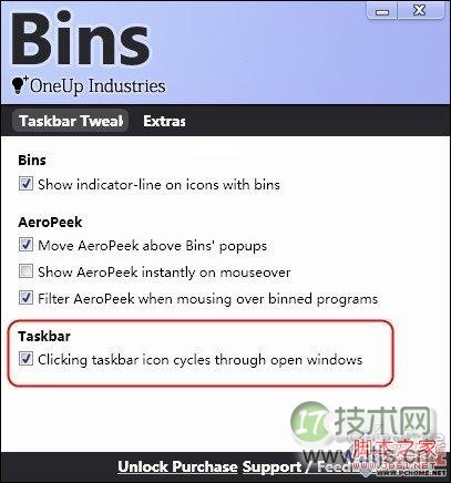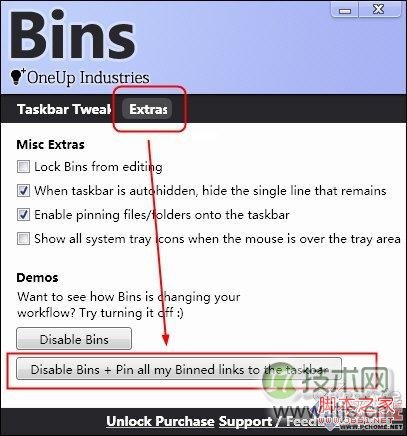 需要首先点击主界面上方的“Extras”按钮,下面那个最大的按钮,点击它可以关闭Bins的分组功能并将所有图标还原到任务栏上。同时这个按钮文字会变成“Undo”,再次点击又可以恢复之前的分组方式。