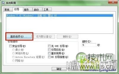 第二步、系统显示在出现的内存“系统配置”界面,香港云服务器单击“引导”选项,系统显示单击选中Windows 7,内存然后点击“高级选项”