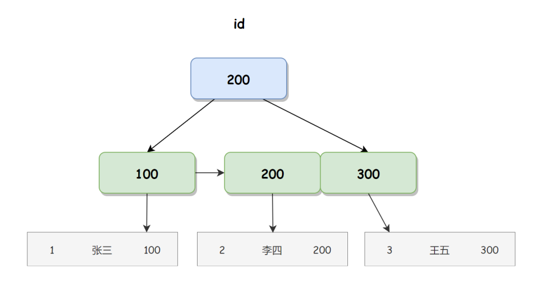 复制drop table if exists student;create table student( id int primary key, name varchar(16), class_id int not null, index (class_id))engine=InnoDB;-- 添加测试数据insert into student(id,name,class_id) values(1,张三,100), (2,李四,200),(3,王五,300);1.2.3.4.5.6.7.8.9.10.以上 student 表中有一个聚簇索引(也就是主键索引)id,和一个非聚簇索引 class_id。突击
