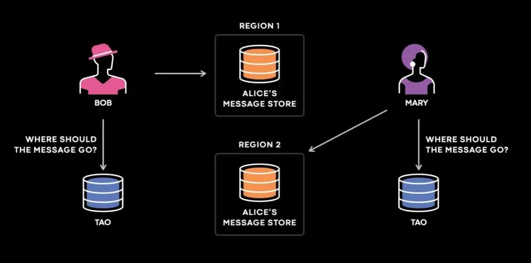 想象一下,在将Alice的主消息存储从区域2切换到区域1后,Bob和Mary,都向Alice发送了消息。当Bob向Alice发送消息时,系统查询了靠近Bob居住地的区域的TAO副本,并将消息发送到区域1。当Mary向Alice发送消息时,系统查询了靠近Mary居住地的地区的TAO副本,命中了不一致的TAO副本,并将消息发送到了地区2。Bob和Mary将他们的消息发送到不同的区域,而两个区域都没有爱丽丝消息的完整副本。