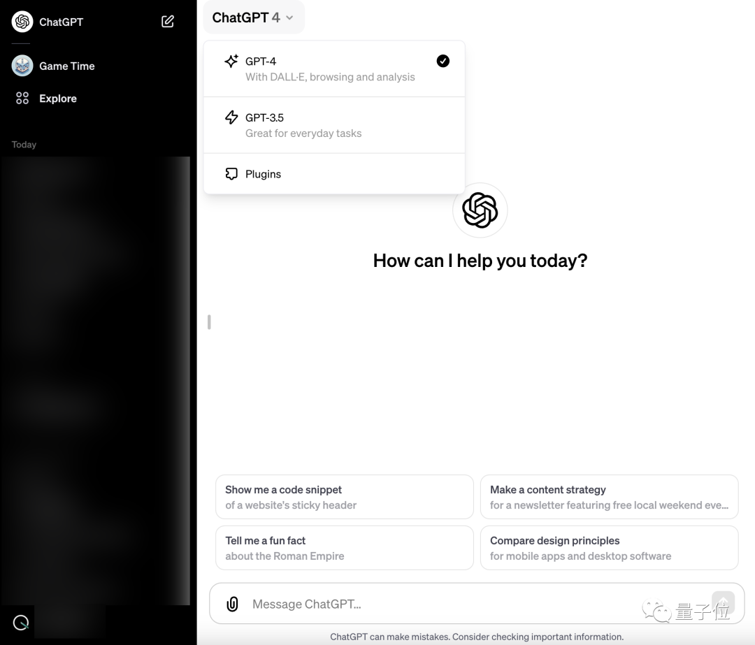 侧边栏中加入了GPTs相关的“角色选择”,模型版本(3.5/4)的切换也从聊天框上方正中移到了左上角。