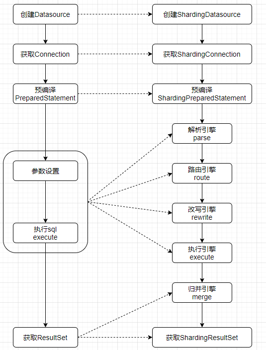 复制org.apache.shardingsphere.shardingjdbc.jdbc.core.statement#execute public boolean execute() throws SQLException { try { clearPrevious(); //解析+路由+重写 内部调用BasePrepareEngine#prepare方法 prepare(); initPreparedStatementExecutor(); //执行 return preparedStatementExecutor.execute(); } finally { clearBatch(); } } org.apache.shardingsphere.underlying.pluggble.prepare.BasePrepareEngine#prepare public ExecutionContext prepare(final String sql, final List<Object> parameters) { List<Object> clonedParameters = cloneParameters(parameters); //解析+路由(executeRoute内部先进行解析再执行路由) RouteContext routeContext = executeRoute(sql, clonedParameters); ExecutionContext result = new ExecutionContext(routeContext.getSqlStatementContext()); //重写 result.getExecutionUnits().addAll(executeRewrite(sql, clonedParameters, routeContext)); if (properties.<Boolean>getValue(ConfigurationPropertyKey.SQL_SHOW)) { SQLLogger.logSQL(sql, properties.<Boolean>getValue(ConfigurationPropertyKey.SQL_SIMPLE), result.getSqlStatementContext(), result.getExecutionUnits()); } return result; } org.apache.shardingsphere.shardingjdbc.jdbc.core.statement.ShardingPreparedStatement#getResultSet public ResultSet getResultSet() throws SQLException { if (null != currentResultSet) { return currentResultSet; } if (executionContext.getSqlStatementContext() instanceof SelectStatementContext || executionContext.getSqlStatementContext().getSqlStatement() instanceof DALStatement) { List<ResultSet> resultSets = getResultSets(); //归并结果集 MergedResult mergedResult = mergeQuery(getQueryResults(resultSets)); currentResultSet = new ShardingResultSet(resultSets, mergedResult, this, executionContext); } return currentResultSet; }1.2.3.4.5.6.7.8.9.10.11.12.13.14.15.16.17.18.19.20.21.22.23.24.25.26.27.28.29.30.31.32.33.34.35.36.37.38.39.40.41.从对比的执行流程图可见: