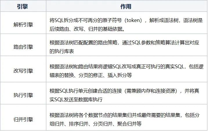 【JDBC】:执行的主要流程是通过Datasource获取Connection,再注入SQL语句生成PreparedStatement对象,PreparedStatement设置占位符参数执行后得到结果集ResultSet。【Sharding-JDBC】:主要流程基本一致,但Sharding基于PreparedStatement进行了实现与扩展,具体实现类ShardingPreparedStatement中会抽象出解析、路由、重写、归并等引擎,从而实现分库分表、读写分离等能力,每个引擎的作用说明如下表所示:
