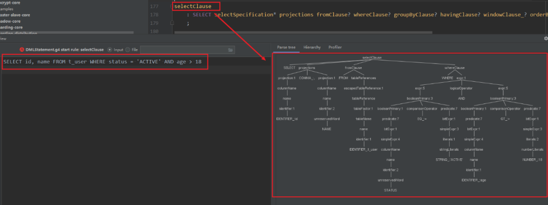 4.x的版本采用ANTLR(ANother Tool for Language Recognition)作为解析引擎,在ShardingSphere-sql-parser-dialect模块中定义了适用于不同数据库语法的解析规则(.g4文件),idea中也可以下载ANTLR v4的插件,输入SQL查看解析后的语法树结果。