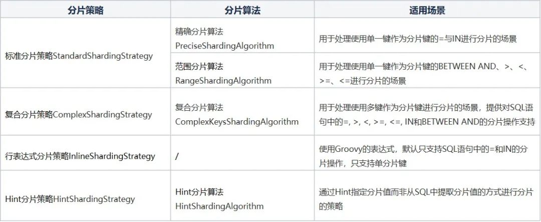 Sharding-JDBC定义了多种分片策略和算法接口,主要的分配策略与算法说明如下表所示: