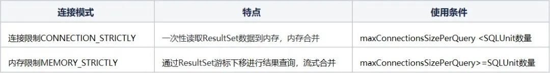 当maxConnectionsSizePerQuery<sqlunit数量时,意味着无法做到每个sqlunit独享一个连接,需要直接查询出结果集至内存中;< li="">当maxConnectionsSizePerQuery>=SQLUnit数量时,意味着可以支持每个SQLUnit独享一个连接,可以通过ResultSet游标下移的方式查询结果集。不过maxConnectionsSizePerQuery默认值为1,所以当一条SQL需要路由至多张表时(即有多个SQLUnit)会采用连接限制,当路由至单表时是内存限制模式。