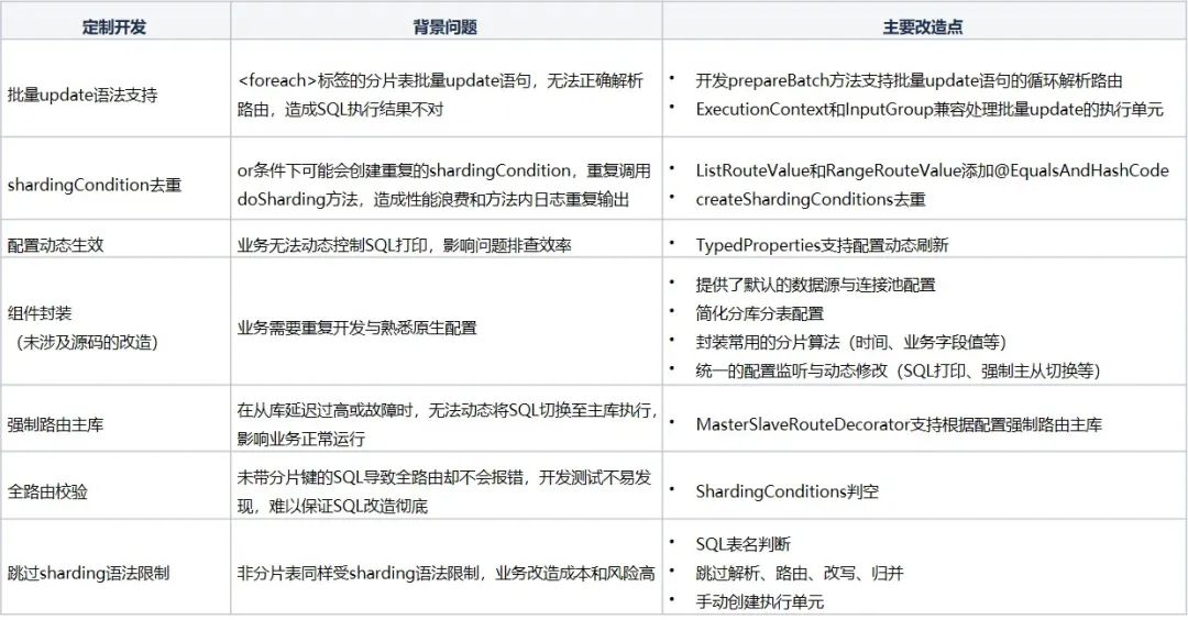4.7 组件封装业务接入Sharding-JDBC的步骤是一样的,都需要通过Java创建数据源和配置对象或者使用SpringBoot进行配置,存在一定的熟悉成本和重复开发的问题,为此我们也对定制开发版本的Sharding-JDBC封装了一个公共组件,从而简化业务配置,减少重复开发,提升业务的开发效率,具体功能可见下。这块没有涉及源码的改造,只是在定制版本上包装的一个公共组件。
