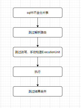 Sharding-JDBC执行解析路由重写的逻辑都是在BasePrepareEngine中,最终构造ExecutionContext交由执行引擎执行,ExecutionContext中包含sqlStatementContext和executionUnits,非分片表不涉及路由改写,所以其ExecutionUnit我们非常容易手动构造,而查看SQLStatementContext的使用情况,我们发现SQLStatementContext只会影响结果集的合并而不会影响实际的执行,而不分片表也无需进行结果集的合并,整体实现思路如图。