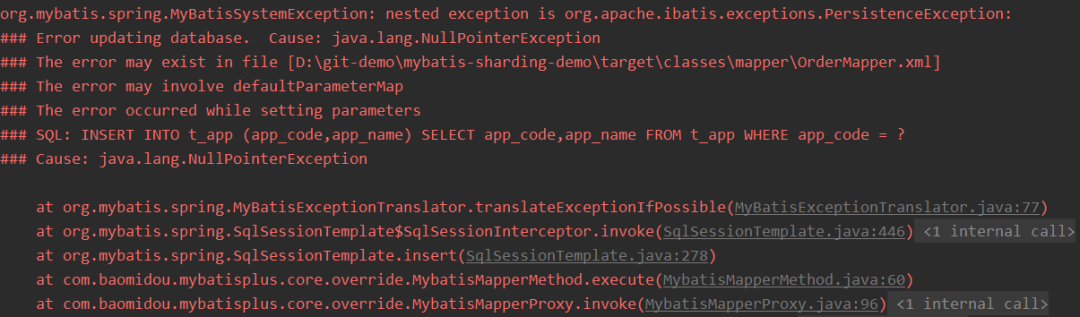 复制org.apache.shardingsphere.shardingjdbc.jdbc.adapter.AbstractConnectionAdapter#close public final void close() throws SQLException { closed = true; MasterVisitedManager.clear(); TransactionTypeHolder.clear(); RuleContextManager.clear(); int connectionSize = cachedConnections.size(); try { forceExecuteTemplateForClose.execute(cachedConnections.entries(), cachedConnections -> cachedConnections.getValue().close()); } finally { cachedConnections.clear(); rootInvokeHook.finish(connectionSize); } }1.2.3.4.5.6.7.8.9.10.11.12.13.14.举个例子,比如Sharding-JDBC本身是不支持INSERT INTO tbl_name (col1, col2, …) SELECT col1, col2, … FROM tbl_name WHERE col3 = ? 这种语法的,会报空指针异常。