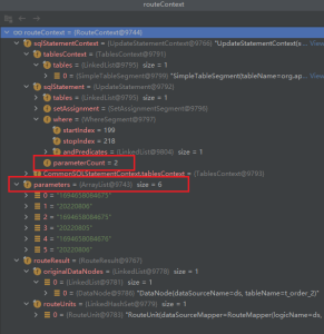复制@RequiredArgsConstructor @Getter @EqualsAndHashCode @ToString public final class ExecutionUnit { private final String dataSourceName; private final SQLUnit sqlUnit; } @AllArgsConstructor @RequiredArgsConstructor @Getter @Setter //根据sql判断是否相等 @EqualsAndHashCode(of = { "sql" }) @ToString public final class SQLUnit { private String sql; private final List<Object> parameters; }1.2.3.4.5.6.7.8.9.10.11.12.13.14.15.16.17.18.19.20.21.22.23.24.25.createSQLRewriteContext完成了两件事,一个是对SQL参数进行了重写,一个是生成了SQLToken。