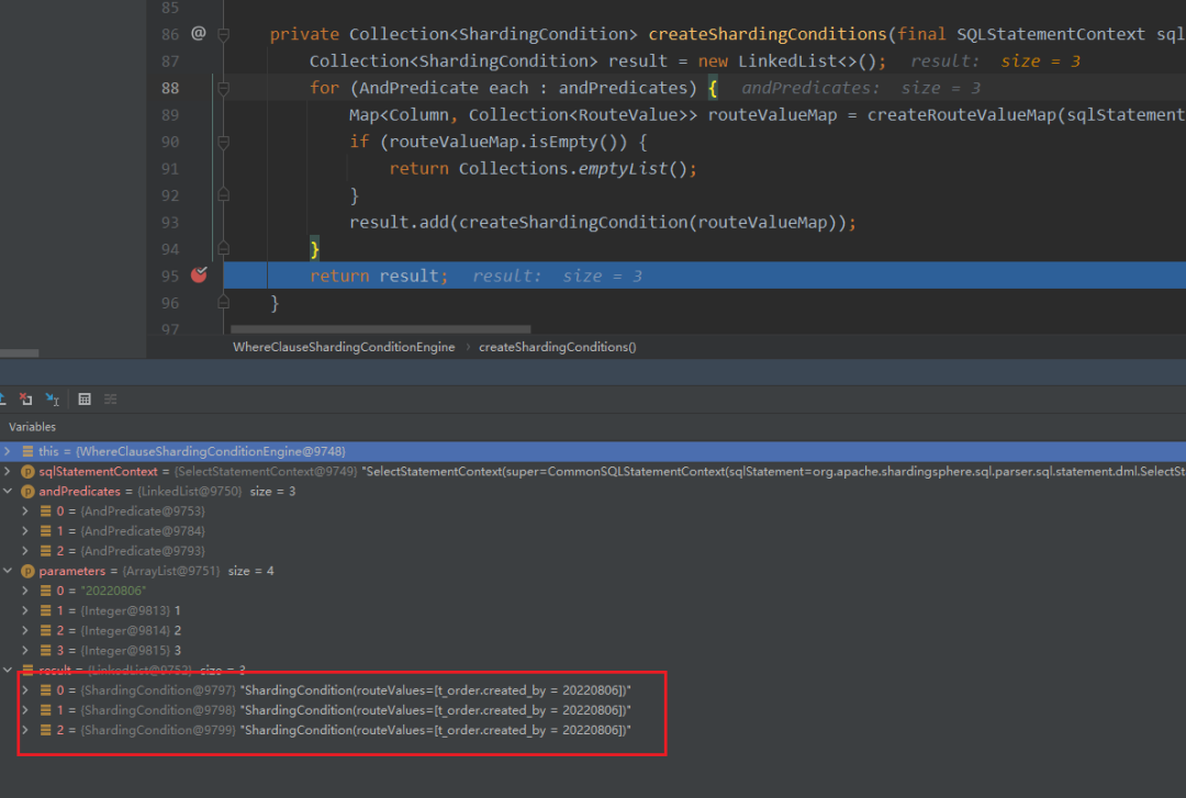 ShardingCondition中只有一个变量routeValues,RouteValue是一个接口,有ListRouteValue和RangeRouteValue两种实现,前者记录了分片键的in或=条件的分片值,后者则记录了范围查询的分片值,两者被封装为ShardingValue对象后,将会透传至分片算法中计算得到分片结果集。