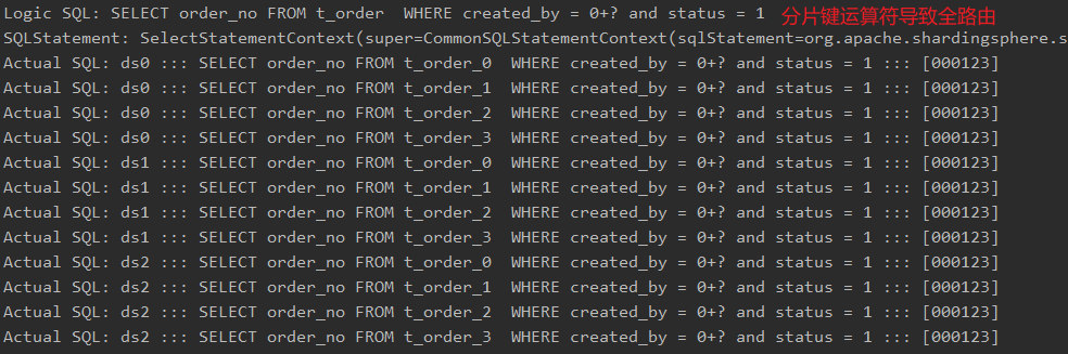 复制org.apache.shardingsphere.sharding.route.engine.condition.engine.WhereClauseShardingConditionEngine#createShardingConditions private Collection<ShardingCondition> createShardingConditions(final SQLStatementContext sqlStatementContext, final Collection<AndPredicate> andPredicates, final List<Object> parameters) { Collection<ShardingCondition> result = new LinkedList<>(); for (AndPredicate each : andPredicates) { Map<Column, Collection<RouteValue>> routeValueMap = createRouteValueMap(sqlStatementContext, each, parameters); if (routeValueMap.isEmpty()) { return Collections.emptyList(); } result.add(createShardingCondition(routeValueMap)); } //去重 Collection<ShardingCondition> distinctResult = result.stream().distinct().collect(Collectors.toCollection(LinkedList::new)); return distinctResult; }1.2.3.4.5.6.7.8.9.10.11.12.13.14. 4.6 全路由校验分片表的SQL中如果没有携带分片键(或者带上了分片键结果没有被正确解析)将会导致全路由,产生性能问题,而这种SQL并不会报错,这就导致在实际的业务改造中,开发和测试很难保证百分百改造彻底。为此,我们在源码层面对这种情况做了额外的校验,当产生全路由,也就是ShardingConditions为空时,主动抛出异常,从而方便开发和测试能够快速发现全路由SQL。