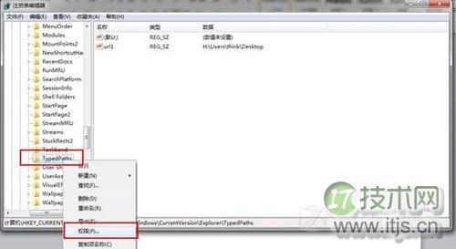 第三步:在搜索到的栏下拉列” TypedPaths”,右键单击选择“权限”