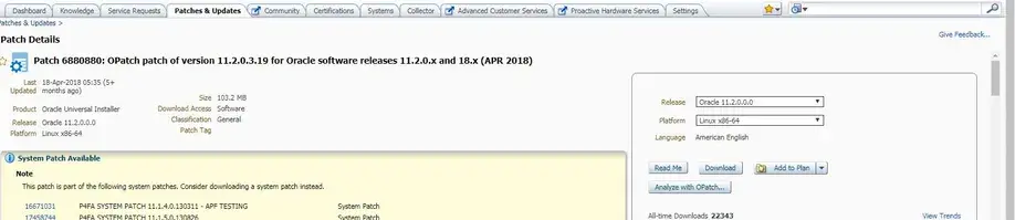 from : /u01/app/oracle/product/11.2.0/db_1/oraInst.locOPatch version : 11.2.0.3.19OUI version : 11.2.0.4.0Log file location : /u01/app/oracle/product/11.2.0/db_1/cfgtoollogs/opatch/opatch2018-10-08_09-41-09AM_1.logLsinventory Output file location : /u01/app/oracle/product/11.2.0/db_1/cfgtoollogs/opatch/lsinv/lsinventory2018-10-08_09-41-09AM.txt--------------------------------------------------------------------------------Local Machine Information::Hostname:ARU platform id: 226ARU platform description:: Linux x86-64Installed Top-level Products (1):Oracle Database 11g 11.2.0.4.0There are 1 products installed inthis Oracle Home.