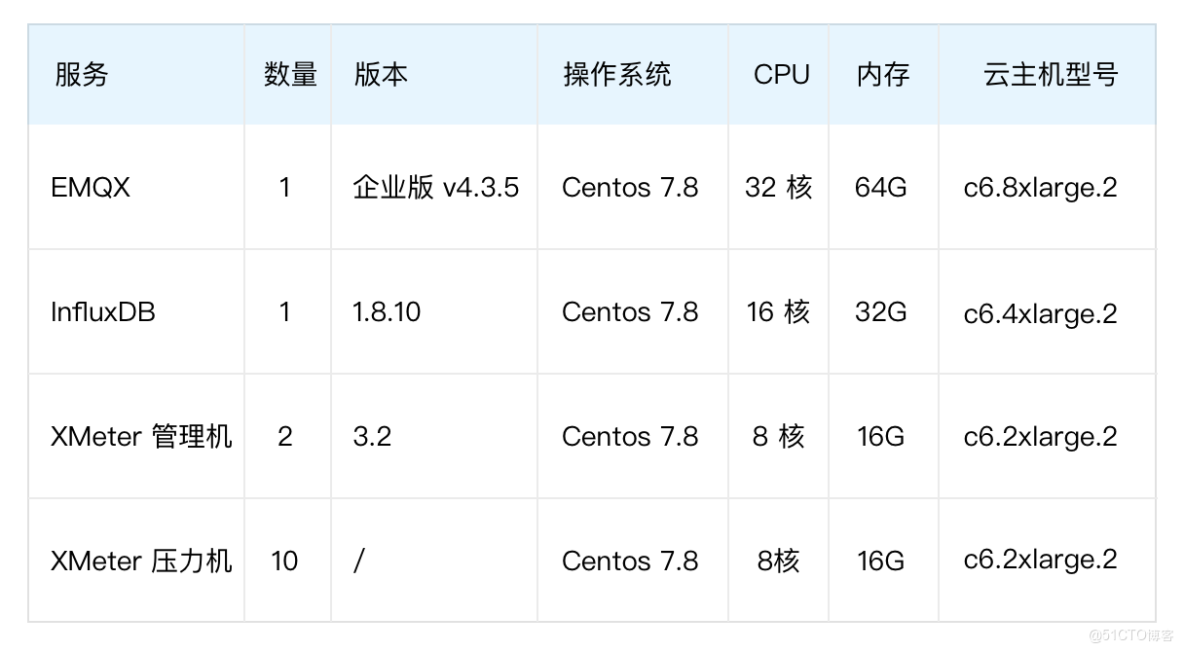 支持千万级车辆连接、百万级消息吞吐能力。分布式集群架构,稳定可靠,支持动态水平扩展。强大的规则引擎和数据桥接、持久化能力,支持百万级消息吞吐处理。拥有丰富 API 与认证等系统能顺利对接。百万吞吐场景验证为了验证上述架构的吞吐能力,在条件允许的情况下,我们可以通过以下配置搭建百万级消息吞吐测试场景。压测工具可以选用 Benchmark Tools、JMeter 或 XMeter 测试平台。共模拟 100 万设备,每个设备分别都有自己的主题,每个设备每秒发送一次消息,持续压测 12 小时。
